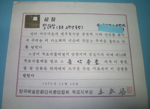 | Çѱ¹¿¹¼ú¹®È´ÜüÃÑ¿¬ÇÕȸ ÁÖÃÖ 'Á¦14ȸ ¸ñÆ÷¿¹¼úÁ¦ À½¾Ç ÄáŬ' Àå·Á»ó(1972³â) |