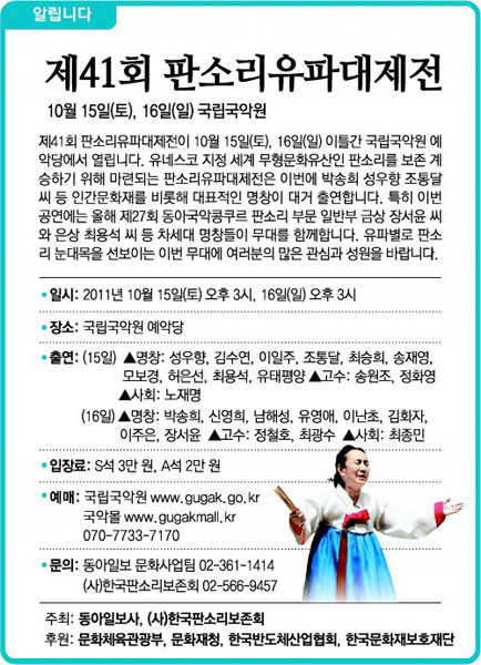 2011.10.15(Åä) 15:00, 10.16(ÀÏ) 15:00 ±¹¸³±¹¾Ç¿ø ¿¹¾Ç´ç ¡®Á¦41ȸ ÆÇ¼Ò¸® À¯ÆÄ ´ëÁ¦Àü¡¯