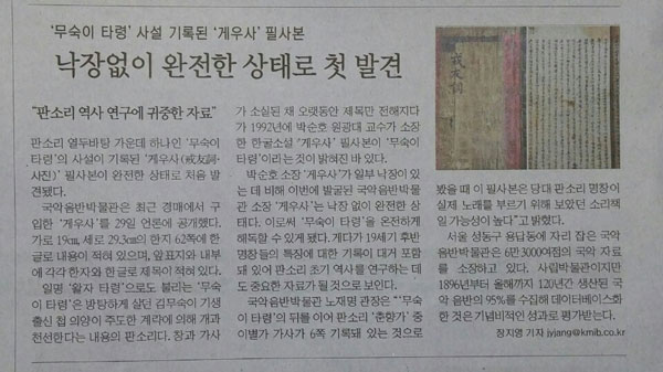 "¹«¼÷ÀÌŸ·É »ç¼³ ±â·ÏµÈ ¡®°Ô¿ì»ç¡¯ Çʻ纻, ³«Àå¾øÀÌ ¿ÏÀüÇÑ »óÅ·Πù ¹ß°ß - ÆÇ¼Ò¸® ¿ª»ç ¿¬±¸¿¡ ±ÍÁßÇÑ ÀÚ·á"