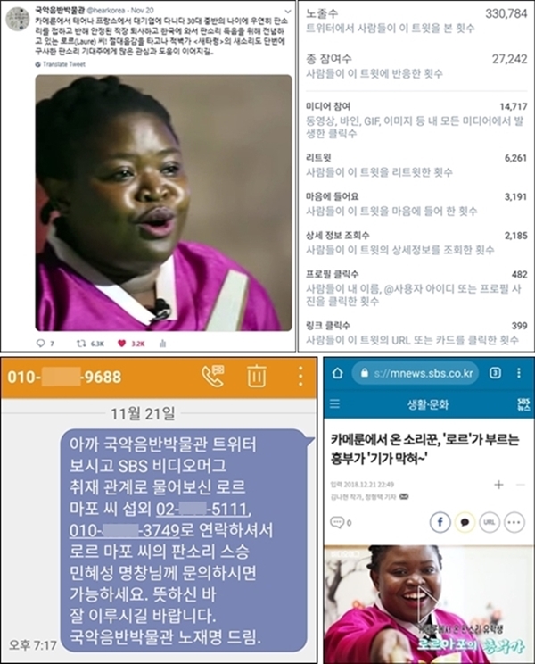 Ä«¸Þ·é¿¡¼ ž ÇÁ¶û½º¿¡¼ ´ë±â¾÷¿¡ ´Ù´Ï´Ù 30´ë Áß¹ÝÀÇ ³ªÀÌ¿¡ ¿ì¿¬È÷ ÆÇ¼Ò¸®¸¦ Á¢ÇÏ°í ¹ÝÇØ ¾ÈÁ¤µÈ Á÷Àå Åð»çÇϰí Çѱ¹¿¡ ¿Í¼ ÆÇ¼Ò¸® µæÀ½À» À§ÇØ Àü³äÇϰí ÀÖ´Â ÆÇ¼Ò¸® ±â´ëÁÖ ·Î¸£ ¸¶Æ÷(Laure Mafo) ¾¾¿¡ ´ëÇØ 2018³â 11¿ù 20ÀÏ ±¹¾ÇÀ½¹Ý¹Ú¹°°ü Æ®À§ÅÍ https://twitter.com/hearkorea¿¡ ±¹¾ÇÀ½¹Ý¹Ú¹°°ü ³ëÀç¸í °üÀåÀÌ ¾´ ±ÛÀ» º¸°í 2018³â 11¿ù 21ÀÏ SBS ¹æ¼Û±¹ ±è³ªÇö ÀÛ°¡°¡ ·Î¸£ ¸¶Æ÷ ¾¾¸¦ ÃëÀçÇÏ°í ½Í´Ù°í ±¹¾ÇÀ½¹Ý¹Ú¹°°ü¿¡ ¿¬¶ôÀ» ÇØ¿Í¼ ·Î¸£ ¸¶Æ÷¾¾¸¦ ¼Ò°³ÇÏ¿© 2018³â 12¿ù 21ÀÏ ´ÙÀ½°ú °°Àº SBS ÀÎÅÍ³Ý ´º½º ¹æ¼Û µ¿¿µ»óÀÌ Á¦ÀÛµÇ¾î ¹ßÇ¥µÊ.