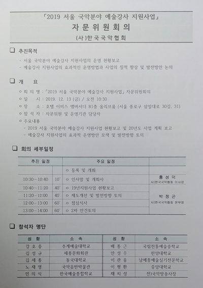 ¼¿ï½Ã ±¹¾Ç ºÐ¾ß ¿¹¼ú°»ç Áö¿ø»ç¾÷ ÀÚ¹®È¸ÀÇ: 2019³â 12¿ù 13ÀÏ 10:30~13:30 Âü¼®. ¼¿ï½Ã ±¹¾Ç ºÐ¾ß ¿¹¼ú°»ç Áö¿ø»ç¾÷ °ËÅä, ÀÚ¹®.