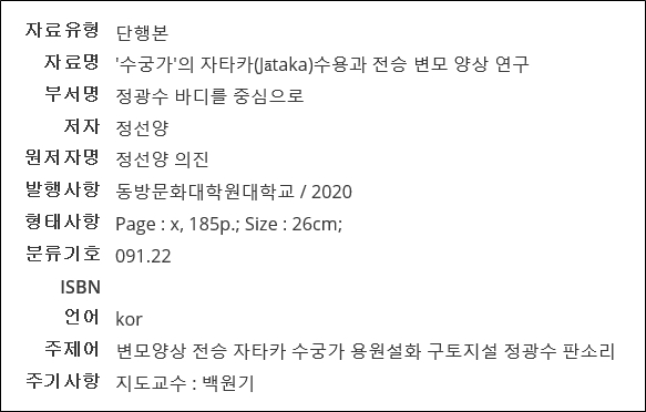 Á¤¼±¾ç(Á¤ÀÇÁø ¸íâ) ³í¹® "¼ö±Ã°¡ÀÇ ÀÚŸī(Jātaka) ¼ö¿ë°ú Àü½Â º¯¸ð ¾ç»ó ¿¬±¸-Á¤±¤¼ö ¹Ùµð¸¦ Áß½ÉÀ¸·Î"(µ¿¹æ¹®È´ëÇпø´ëÇб³ ºÒ±³¹®¿¹Çаú ¹Ú»çÇÐÀ§ ³í¹® 2019³â, ÃÑ 185ÂÊ) ÁýÇÊ ¿¬±¸¿ëÀ¸·Î ±¹¾ÇÀ½¹Ý¹Ú¹°°ü ¼ÒÀå °ü·ÃÀÚ·áµéÀ» 2006³â 1¿ù 1ÀÏ~2019³â 8¿ù 5ÀÏ Á¦°øÇÔ.