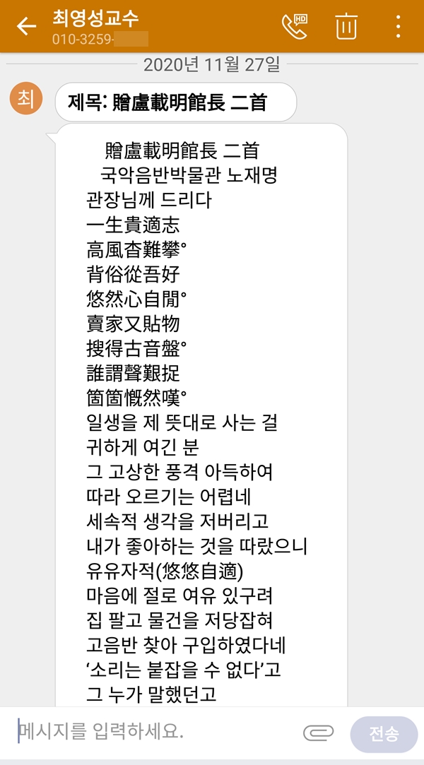 ÃÖ¿µ¼º ÇÐÀÚ´Ô(Çѱ¹ÀüÅ빮ȴëÇб³ ±³¼ö´Ô)ÀÌ 2020³â 11¿ù 27ÀÏ ±¹¾ÇÀ½¹Ý¹Ú¹°°ü ³ëÀç¸í °üÀå¿¡°Ô ÁØ Çå½Ã!