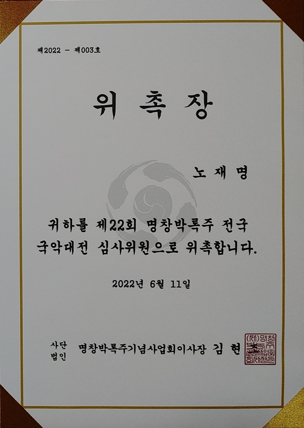 | ±¹¾ÇÀ½¹Ý¹Ú¹°°ü ³ëÀç¸í °üÀå ¡®Á¦22ȸ ¸íâ¹Ú·ÏÁÖ Àü±¹±¹¾Ç´ëÀü¡¯ ¸íâºÎ ½É»çÀ§¿ø(2022³â) |