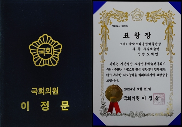 ±¹¾ÇÀ½¹Ý¹Ú¹°°ü ³ëÀç¸í °üÀåÀÌ ±¹È¸ÀÇ ÀÌÁ¤¹® ±¹È¸ÀÇ¿ø ǥâÀåÀ» ¼ö»óÇÔ(2024³â)