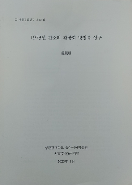 ±¹¾ÇÀ½¹Ý¹Ú¹°°ü ³ëÀç¸í °üÀå ³í¹® "1973³â ÆÇ¼Ò¸® °¨»óȸ ¹æ¸í·Ï ¿¬±¸" ¹ßÇ¥(2023³â)
