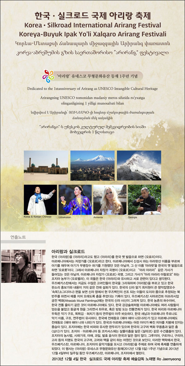 * ÀÌ´Â 'Çѱ¹-½ÇÅ©·Îµå ±¹Á¦ ¾Æ¸®¶û ÃàÁ¦'(2013³â 12¿ù 4~11ÀÏ ¿ìÁŰ½ºÅº¡¤¾Æ¸£¸Þ´Ï¾Æ¡¤Á¶Áö¾Æ °³ÃÖ, ÁÖÃÖ:Institute of North-East Asian Music) ¾È³» Àμ⹰ 4ÂÊ¿¡ ½Ç¸° ±ÛÀÇ ÃʰíÀÔ´Ï´Ù.